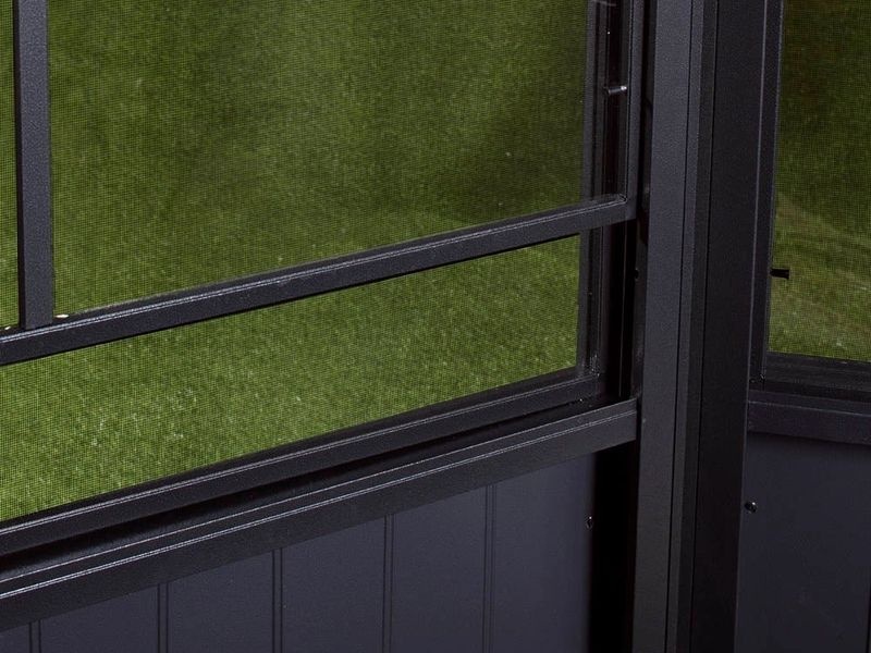 Vetranie a prienik svetla je umožnený pomocou 14 okien, jedno v každom stenovom prvku (š. 94 × v. 74 cm). Každé z nich sa skladá z moskytiéry a okna z PVC fólie odolnej proti roztrhnutiu, ktoré sa na vetranie jednoducho zasunie a na čistenie sa v dvoch jednoduchých krokoch odstráni. Môžete sa tak tešiť výhľadom na svoju záhradu aj počas dažďa a vychutnať si chvíle pokoja a pohody.