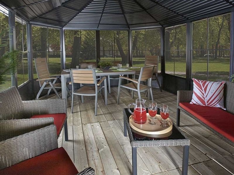 Altánok nemá sklenenú ani plastovú výplň okien. Výrobca zasklenie pre tento model nevyrába. Altánok je zo svojej podstaty ľahká a vzdušná záhradná stavba, ktorá nemá zasklené steny ani okenné výplne. Súčasťou balenia sú však moskytiéry proti komárom.