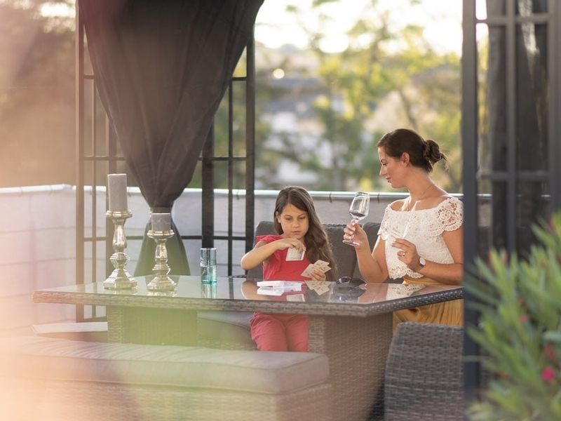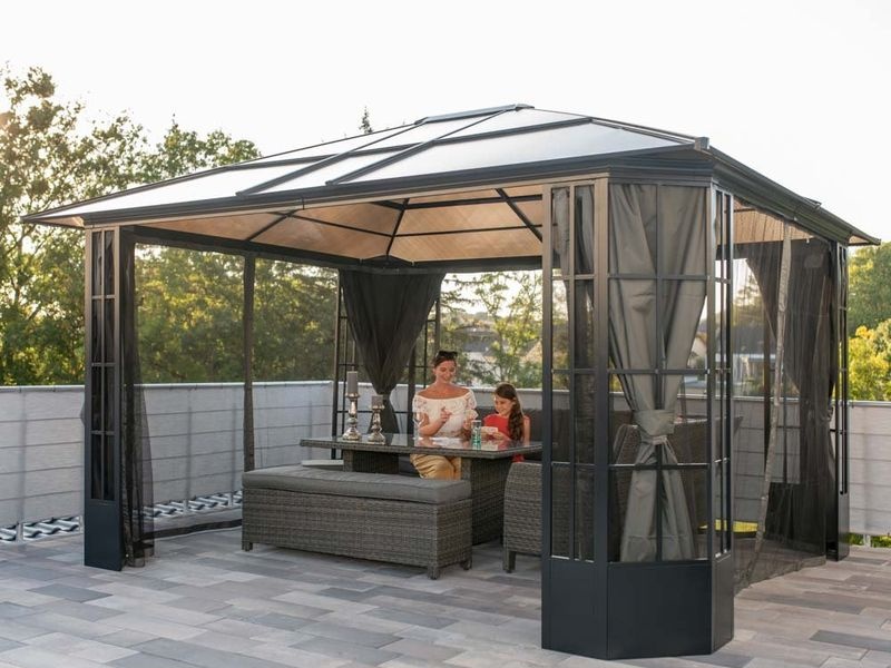 Súčasťou altánku sú nylonové moskytiéry. K nim je možné dokúpiť tmavosivé polyesterové závesy. Tie dodajú altánku elegantný nádych a v lete poskytnú príjemný tieň. Oboje možno vďaka systému dvojitých koľajníc pripevniť k sebe. Na rozdiel od iných modelov sa nejedná o jedno alebo druhé – moskytiéru aj závesy možno používať súčasne.