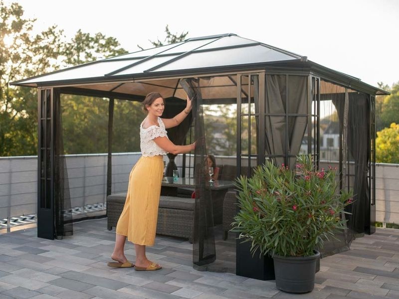 Hliníkový altánok vám vytvorí príjemné a útulné miesto na oddych hneď vedľa vášho domu alebo kdekoľvek na záhrade. Je vybavený moskytiérou, ktorá vás počas vlahých letných večerov ochráni pred komármi.