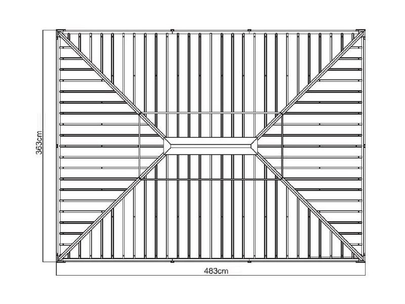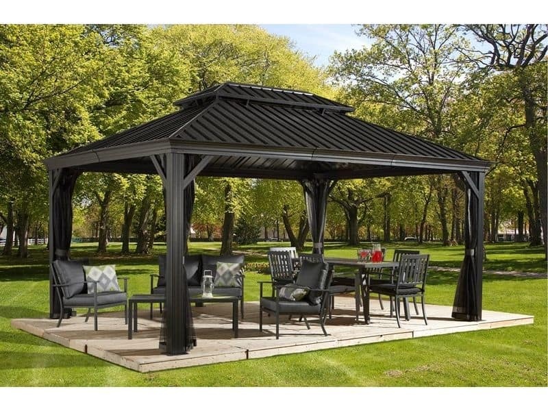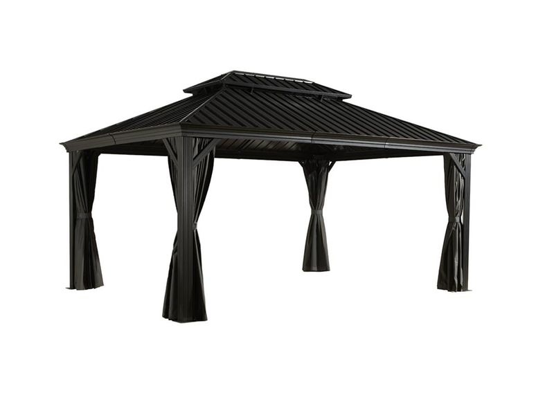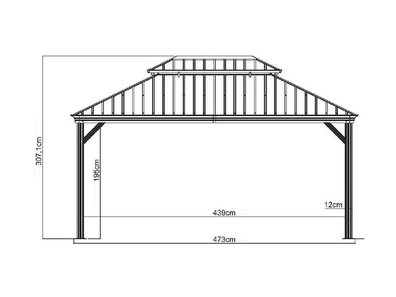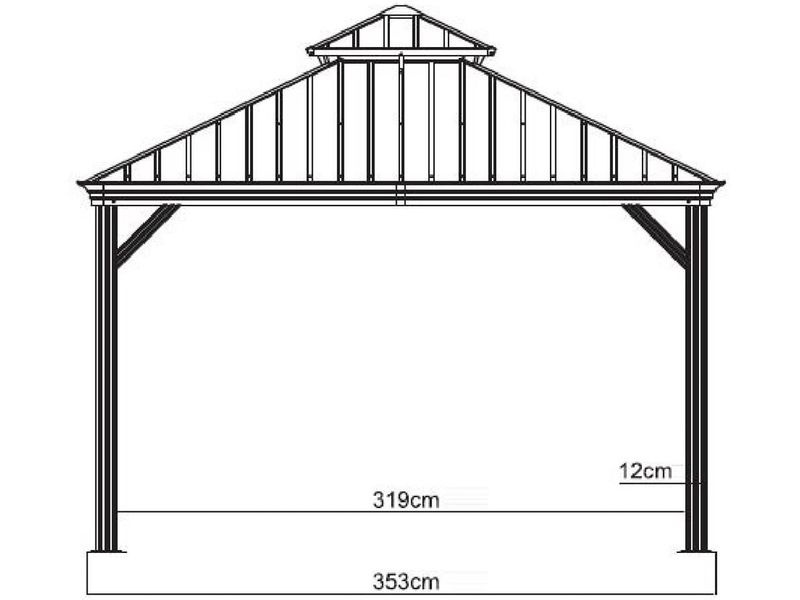 Strecha altánku je vyrobená z odolnej ocele, ktorá je vždy krásne tvarovaná. Zaručuje obzvlášť vysokú stabilitu a ľahko odoláva poveternostným podmienkam, ako je dážď, sneh alebo slnko (UV žiarenie). Vďaka tomu je možné altánok nechať na svojom mieste po celý rok. Súčasťou sú aj dažďové žľaby, ktoré umožňujú odtok dažďovej vody.