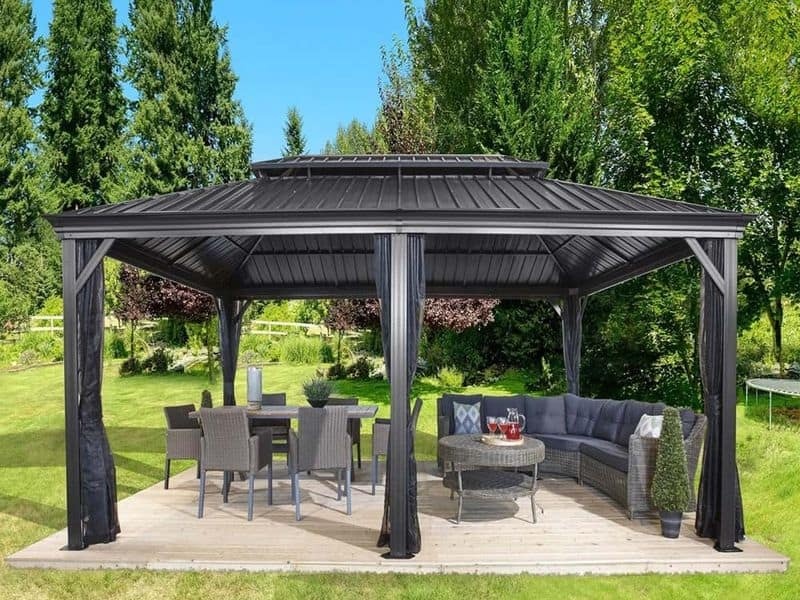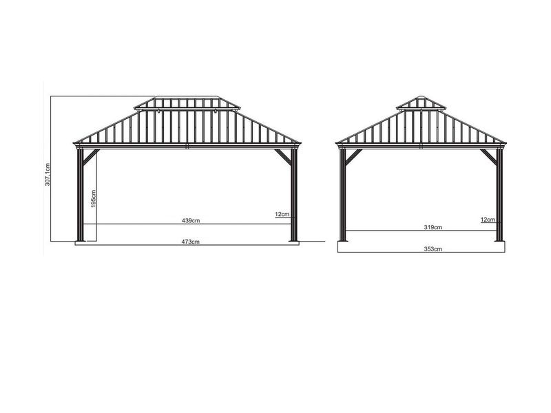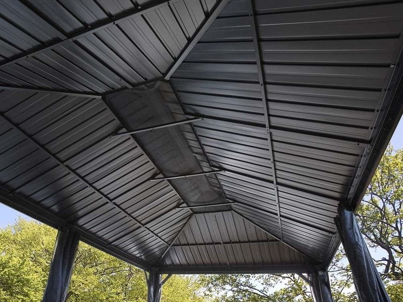 Strecha altánku je vyrobená z odolnej ocele, ktorá je vždy krásne tvarovaná. Zaručuje obzvlášť vysokú stabilitu a ľahko odoláva poveternostným podmienkam, ako je dážď, sneh alebo slnko (UV žiarenie). Vďaka tomu je možné altánok nechať na svojom mieste po celý rok. Súčasťou sú aj dažďové žľaby, ktoré umožňujú odtok dažďovej vody.
