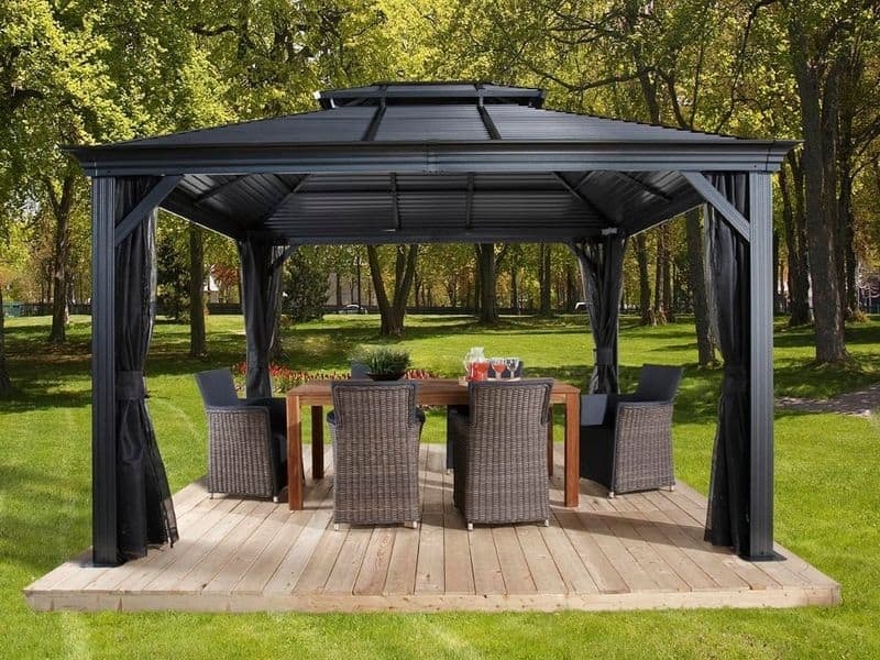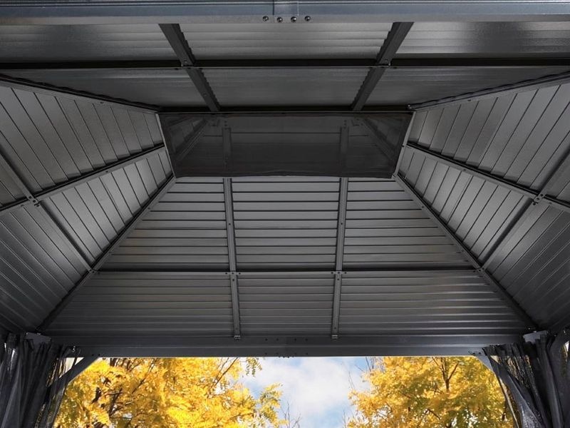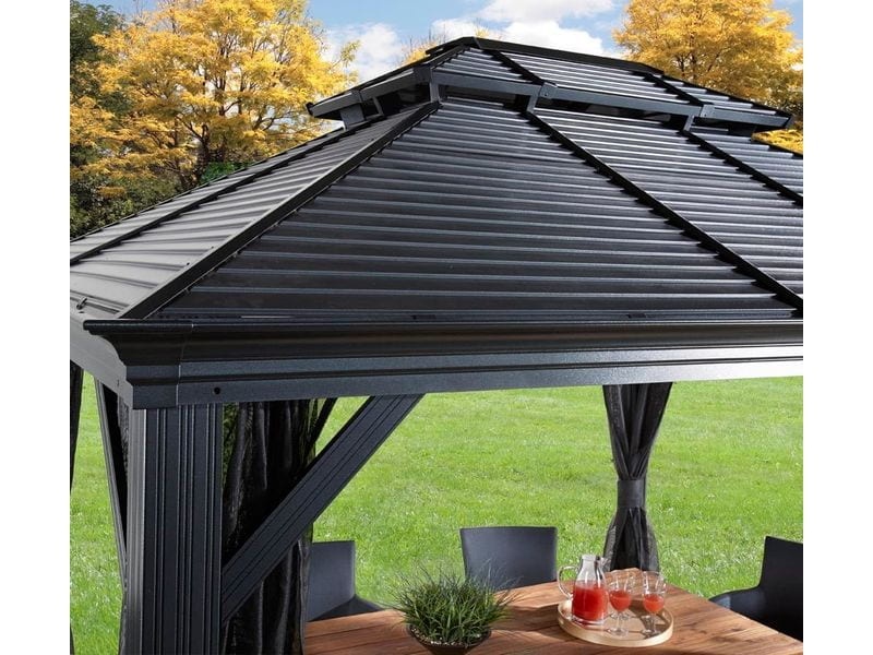 Strecha altánku je vyrobená z odolnej ocele, ktorá je vždy krásne tvarovaná. Zaručuje obzvlášť vysokú stabilitu a ľahko odoláva poveternostným podmienkam, ako je dážď, sneh alebo slnko (UV žiarenie). Vďaka tomu je možné altánok nechať na svojom mieste po celý rok. Súčasťou sú aj dažďové žľaby, ktoré umožňujú odtok dažďovej vody.
